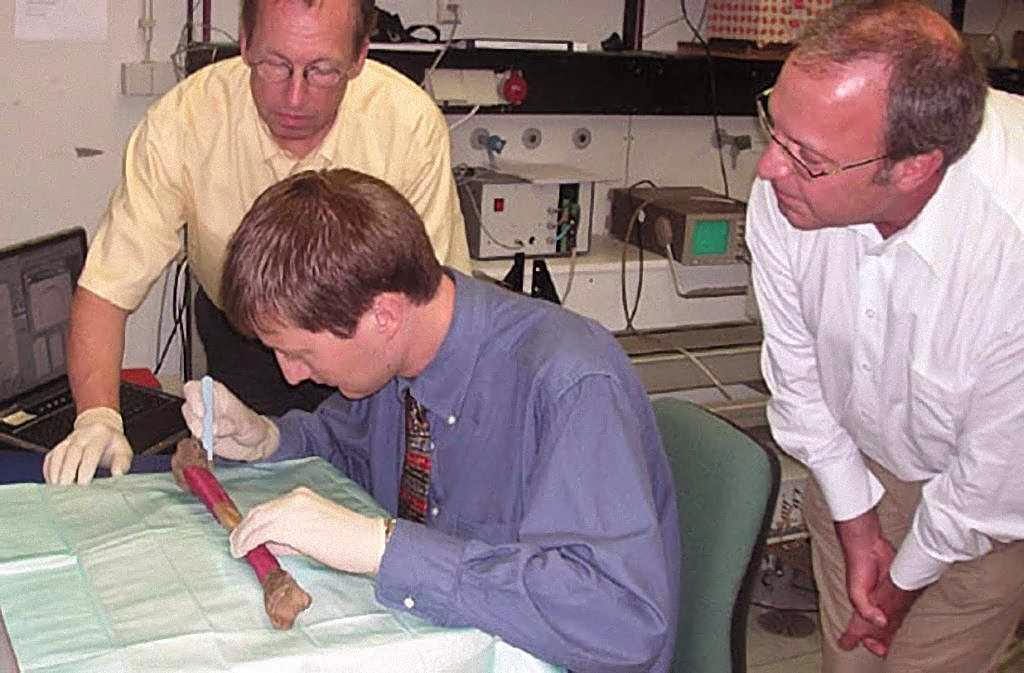 | O prof. Frank Rühli, chefe do Centro de Medicina Evolutiva da Universidade de Zurich, e colegas analisam a tíbia esquerda de Carlos Magno |
